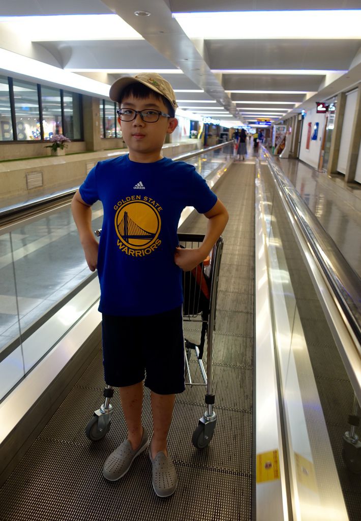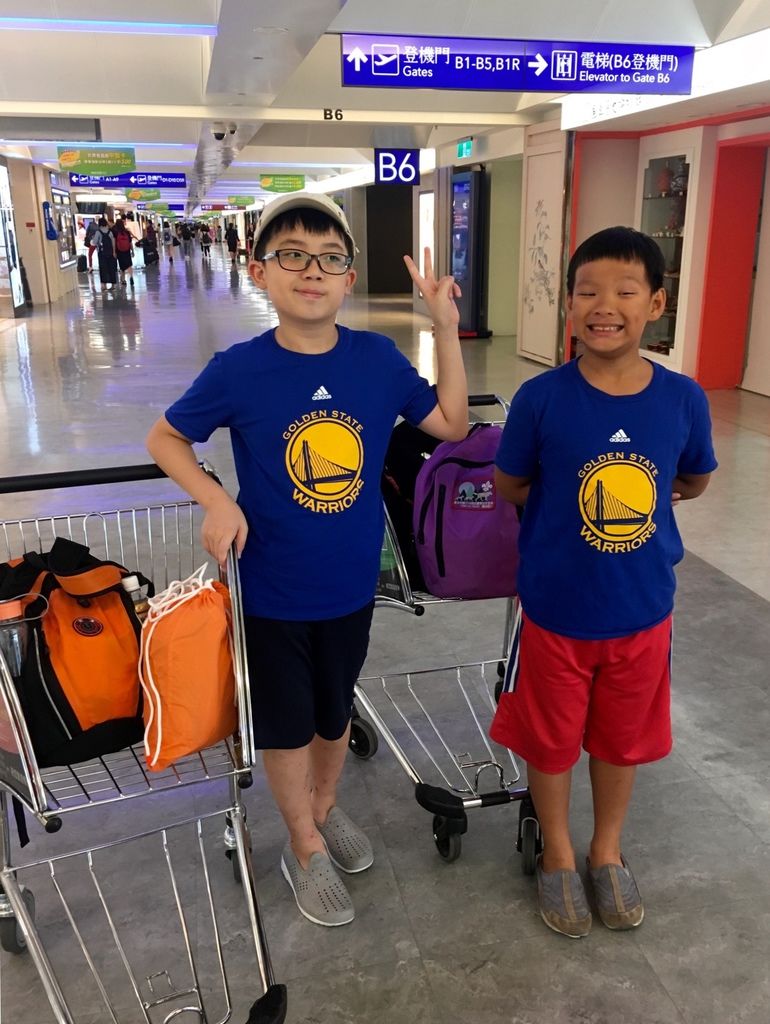 這兩隻特別穿上Joyce阿姨送的金州勇士隊服搭機,萬一在機場走丟比較好認。